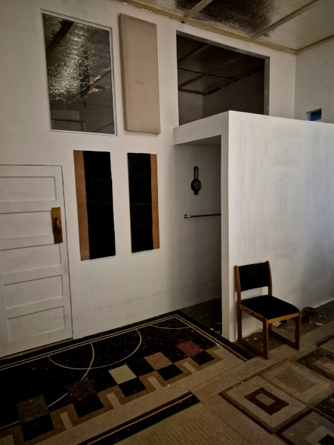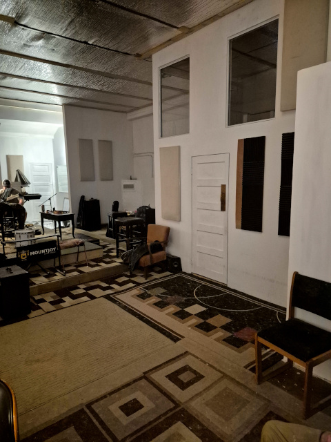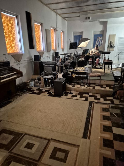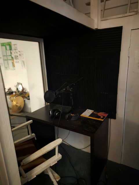 From the main room we can do stage work or find our way into the vocal booth. Notice how I've recently insulated and framed the ceiling! Throughout the summer I'll put a layer of plywood on it as well for even better R value and sound control.